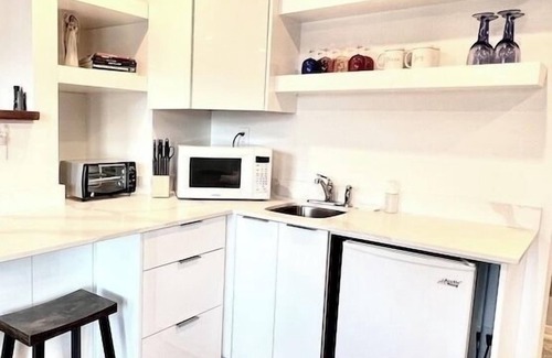 The kitchen has mini bar fridge, microwave, toaster oven, coffee machine, hot water kettle, utensils, salt, and pepper, pots, and pans. There is no stove or hot plate in the suite, but there is a BBQ outside on the patio has a side burner for guests to cook.
