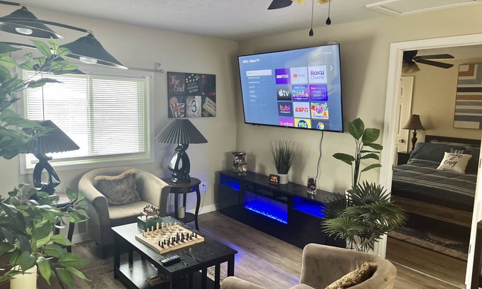 This cozy place is complete with all types of board games for your personal enjoyment and satisfaction. It also has a 70-inch TV with free streamings of popular movie platforms such as Netflix, Hulu, and Disney Plus. It is an ideal place for couples, whole families, friends or co-workers traveling together for fun. This apartment house is a 3-5 minute drive from downtown near the area's best activities, attractions and entertainment.