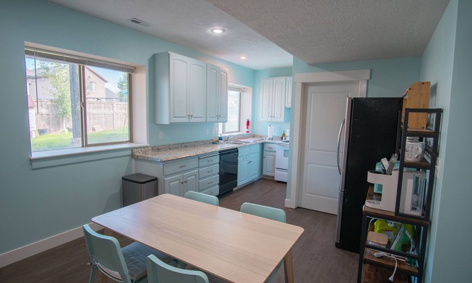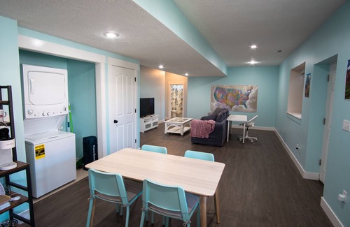 Discover comfort in our 2-bed basement apartment in Eagle Mountain. Unwind in king-sized beds and enjoy meals from a fully-equipped kitchen. The spacious great room features a sofa bed for extra guests and a large TV. Your private oasis includes a dedicated parking space, and a separate entrance with your own code.