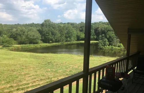 2nd floor 560'sf apt is isolated from the other 3 in the building & has its own 122sf deck overlooking our beautiful valley & pond. The spacious bedroom has a king bed. The full bath includes a stack washer/dryer. The living room has a pull-out couch, loveseat rocker/recliner, & a dining table for 4 ppl. There is also a large coffee table & 2 end tables. Joined with the living room is the full kitchen. Both the living room & the bedroom have large flat-screen smart tv's. The WiFi gives access to all streaming channels. Apt is in a 4-plex100' behind our home on 5 acres in a beautiful valley at the end of a tree-lined dead-end private rural road near LRAFB & Pine Valley Golf Course, secluded & quiet, yet close to the city wrapped in foam insulation for max sound barrier. If u like fishing, bring your gear to fish the pond 100' from the apt. There are 2 kayaks available for guests to use; also a fire pit near the pond with skewers available for roasting marshmallows, hotdogs, or whatever. If u don't want to wet a hook or get on the water or roast smores near the water, u can enjoy the gorgeous view of the pond & the serenity of our valley.