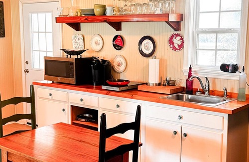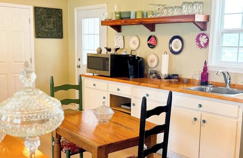 A cozy retreat with plenty of space, featuring 3 bedrooms with 2 twin beds each, 2 full baths, and one half-bath. The beautiful kitchenette is equipped with a 2-burner removable induction cooktop. This cottage is perfect for groups or families seeking a peaceful setting. Enjoy the lovely front or back porch views and immerse yourself in the charming surroundings.