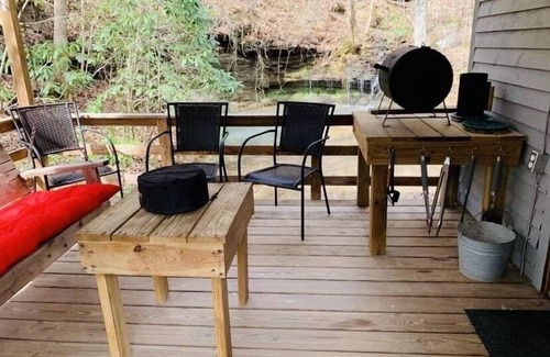 Enjoy a relaxing rock in the porch swing on the large covered deck. A good book and good company, taking in the beauty of this hidden paradise.