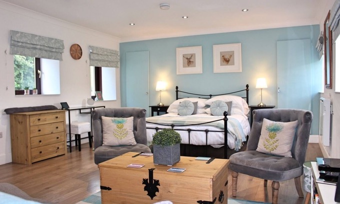 Our studio cottage is a mix of modern and Scottish theme decor epitomising open plan living. We provide a comfy king size bed with extra blankets for extra warmth on those cold winter nights. The property has been well insulated and warmth is provided by electric heating. The comfy sofa can also be a sofa bed. You can watch TV on the sofa or in comfort of your bed as it is attached to a moveable bracket.