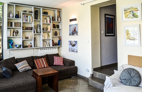 In the striking cottage with artistic decoration you can comfortably settle down with your family for your well-deserved vacation. The playful design and natural fragrance of the wooden furniture, will engage you and give you a cozy feeling. Even the tiled and gas concrete house does not lack the cool temperatures you need. It offers you enough space to engage in various activities, be it a comfortable corner for you and your engrossing novel, or an evening of board games on the kitchen table, as well as a short refreshment in the private outdoor pool or its edge where you can sunbathe and unwind. Furthermore, this accommodation offers you an idyllic outdoor space with lush greenery in the garden and cozy furniture, where you can welcome the morning with your breakfast or sunbathe.