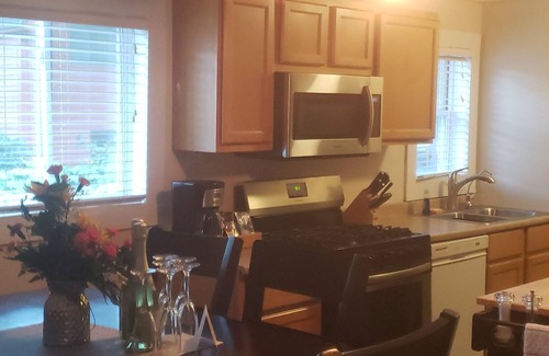 When staying in this home away from home, you can start off your morning soaking up a little fresh air out on the front porch enjoying a cup of freshly brewed Starbucks Verona coffee. After an eventful day exploring all the Chain of Lakes has to offer, both bedrooms have queen size beds with 700 thread count linens and overstuffed pillows for your sleeping comfort. For those less than stellar weather days, cozy on the oversized leather sofa or kick up your feet on the reclining chair in the living room where you can also partake in some viewing enjoyment on the 40” LED television equipped with Xfinity TV or enjoy your favorite DVD by popping it into the DVD player. Feeling a little competitive? Stroll on over the utility closet where you can find several different board and card games to partake in. Secured WiFi internet access is also available. A little hungry? Quickly whip something up on the gas stove in the kitchen that is furnished with all appliances, utensils and dinnerware for your convenience, including an expandable kitchen island. Want make it a BBQ instead? Head outside to your own private patio to access the gas grill.