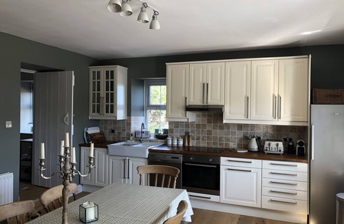 Inside, the cottage is spacious and bright offering a large dining kitchen which is well-equipped with an electric oven and hob, large fridge, dishwasher, kettle, toaster and coffee machine. The kitchen table seats 8 people.
