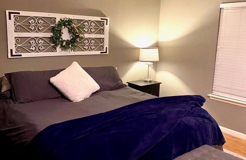 Beautiful lower level 1300 SF walkout with 1 bedrooms with a queen bed, one full bath, living room, kitchenette, and separate entrance. The kitchenette includes a sink, mini-fridge, microwave, large electric skillet, crock pot, toaster oven and coffee maker with complimentary coffee. There is street parking and access to porch, hot tub and grill on back of house.