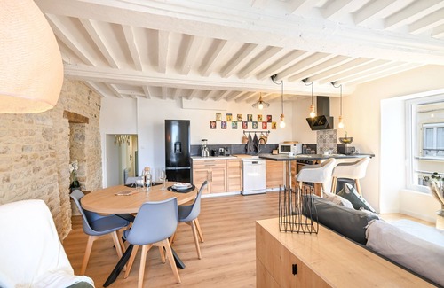 The Cocoonr/Book&Pay agency offers this charming flat for rent in a quiet neighborhood in the center of Isigny-sur-Mer. It has a view of the port and a private entrance, with a surface area of 62 m² and can accommodate up to 2 guests. Located on the 1st floor (no lift) of a townhouse, it consists of a lovely 30 m² living room, an open-plan equipped kitchen, a beautiful bedroom, and an en-suite bathroom (with shower). Wi-Fi (fiber optic) included, we are waiting for you!