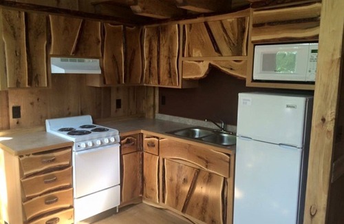 The tree house is built of almost all home sawed lumber. It has two bedrooms, a full bathroom, kitchen, a sitting area in both the loft and the main level. It also has heating and air conditioning making it possible to rent year round. There is a wrap around porch on three sides and a deck out front, To access the tree house you will walk over a thirty foot covered bridge that touches the ground on one side for easy access.
