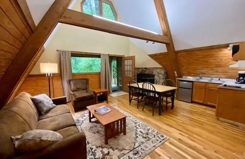 The Chalets A-Frames are iconic, romantic, cozy and comfortable with two queen bed sleeping areas and one full bath. Arranged along the ridge of a hill, each A-Frames has a private deck with hot tub, grill and view into mature woods. Their vaulted open-concept living areas include a kitchenette, dining for four, fire place, flat-screen tv, exposed beams and lots of light. And every one is pet-friendly*! The A-Frames are at the Chalets' Old Man's Cave location of 140 acres, 31 cabins, pool, firepits, SaunaPods, electric vehicle charging stations, office and neighboring General Store. It sits two miles from the epicenter of the region: Hocking Hills State Park visitors center.
