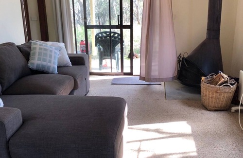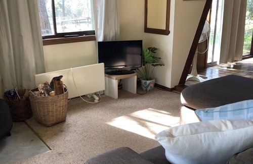 This house is very private and away from the main area where guests would stay. It is fully furnished, self contained. There is a loft upstairs that has 2 single beds. The loft is suitable for children over 8 years of age, as the stair case is a ladder. Small wood fire to keep you cosy. Looks over bushland. Relax on the verandah and catch the afternoon sun. You will have access to the shared mineral spa and pool in the lower area. Onsite parking right at the cabin. Linen and towels provided.