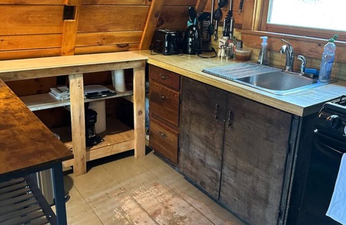 The cabin offers an open bedroom upstairs that fits a queen mattress and an air mattress (if needed). A wood-burning stove, and a cabin feel.