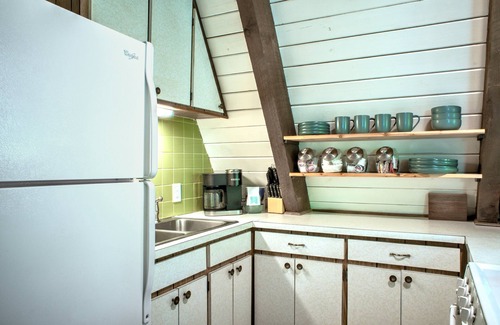 This 2-story a-frame cabin on 1 acre has three bedrooms and one bathroom. There are two bedrooms upstairs. The primary bedroom with a private patio and queen bed overlooks the front of the property. Across the landing, there is another bedroom with a queen bed. The kitchen, bathroom, living room, and one bedroom are on the main floor. Within the downstairs bedroom is a laundry closet with a washer and dryer. The kitchen is fully equipped with pots, pans, dishware, utensils, and storage. The downstairs patio has a gas fireplace and rocking chairs overlooking the front of the property.