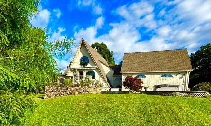 Surrounded by nature and tranquility is this thoughtfully-designed A-frame cottage with plenty of room for up to ten guests to spread out and enjoy the peace and quiet the Blue Ridge Mountains offers.