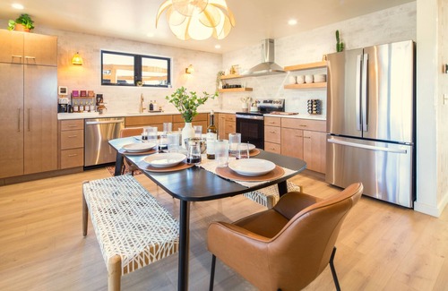 The A-frame offers a cozy yet spacious setting for families and groups. The main house features three bedrooms with modern furnishings, including a master with a queen bed. The ADU mini A-frame provides an additional bedroom for privacy. The bathrooms are sleek and modern, with all the amenities you need for comfort.