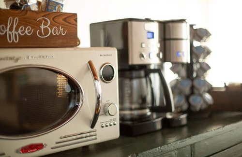 Enjoy the fun, retro themed appliances as you step into the fully equipped kitchen. On your right sits a coffee bar with the option for regular coffee or K-cups (included). We also provide you with a s’mores kit – sure to be a hit at the evening fire pit! The kitchen contains all the essentials such that you can prepare a homemade meal if desired. Additional features include: