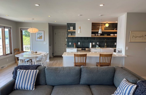 Main Level: Enter the home on the main level that opens up into a great room that includes a full sized kitchen with quartz countertop, coffee station, living room, and dining room. Three bedrooms and three bathrooms are on this main level. The full deck overlooking the river is perfect for morning coffee or evening dinners. expandable exterior patio table for your convenience.