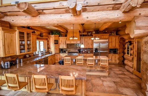 Amenities include 8.5 bathrooms, fully equipped double island kitchen, a truly Great Room all can gather in, a Game Room with pool table, ping pong, foosball, arcade games and more. Three sets of washers and dryers. Plenty of parking, but don't get in the way of the basketball hoop. Over 10,000 square feet of grass area ideal for picnics, lawn games, and stargazing. The outdoor amphitheater is a great place to showcase family talents on a warm summer night. Large outside decks mean you can just sit and stare at the mountains and valley. A small library is a quiet place for one-on-one conversations.
