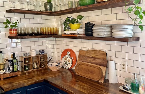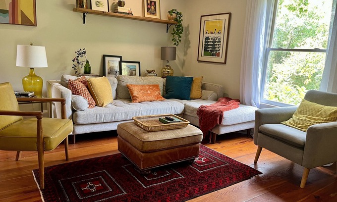The 2,100-square-foot house is adorned with local art from the region and was originally two separate houses that was merged into one. There are cozy nooks throughout the house and ample yard. Ideal for cooking great meals, curling up on cozy couches, sleeping deeply, and listening to the crickets and river. A strong wifi signal via Eero mesh makes it a good place to work if need be. Find your refuge in this spacious yet cozy home in a unique village brimming with natural beauty close to the major hotspot that is North Carolina’s Triangle. Come roll with the river for a while.