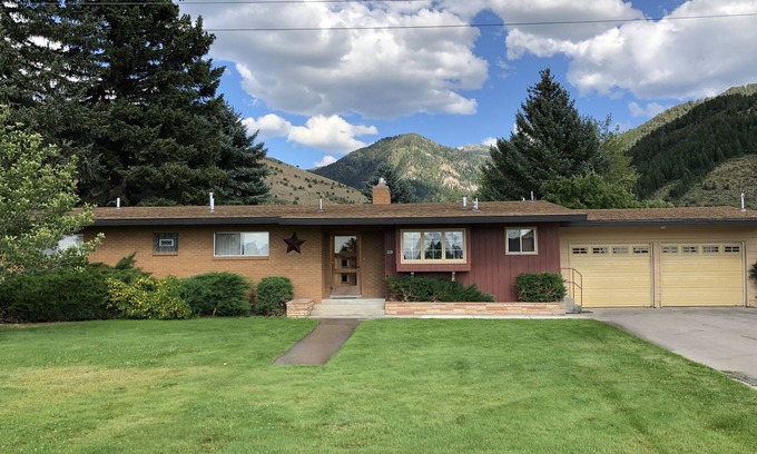 Take in views of towering mountains, have breakfast on the patio, hike to a geyser, or cozy up by the sandstone fireplace in this mid-century modern home. Family friendly. Convenient to gas, groceries & nature. 79 miles to Jackson.