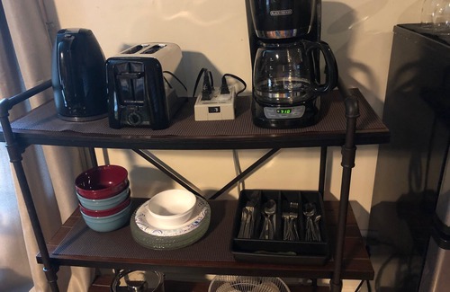 Essential Amenities: Your stay includes a mini fridge, microwave, coffee maker, and breakfast provisions such as water, juice, oatmeal, and coffee, ensuring you have everything needed for a refreshing start to your day or post-wedding brunch.