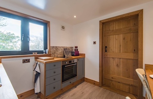 Kitchen with electric oven, hob and microwave, and breakfast bar seating 2
