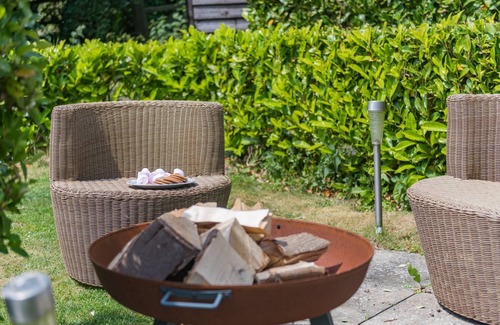 Private terrace with outside table and chairs, and bench seating with small fire pit
