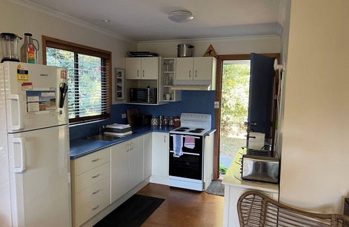 Looking from the deck a profusion of tall eucalypts and casuarinas provide a backdrop to a garden which is home to many birds whom love to make your acquaintance. At the back of the property through the little gate at the side of the fenced garden you can access the saltwater creek that flows down to the beach, an alternative route to the short stroll down the road. The sound of the nearby surf will lull you to sleep at the end of the day.