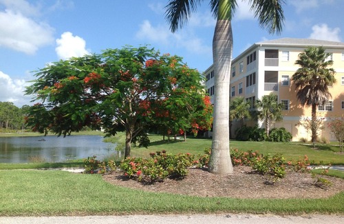 Our beautiful condo has two bedrooms and two bathrooms. The kitchen is upgraded and includes granite countertops and custom wood cabinets and has all the cooking amenities of home. It can sleep 4-6 people very comfortably. There is a queen bed in the master bedroom and a queen bed in the guest bedroom as well as a pull out full sofa bed . The bathrooms are upgraded and have granite countertops, as well as custom wood cabinets. There is also a full size washer and dryer. The entire unit has been custom decorated and setup to give our guests a relaxing and peaceful Florida vacation The condo overlooks the community lake and fountain. One of the most relaxing things to do is to sit on the large screened lanai. There are beautiful views of the lake from the lanai and master bedroom and livingroom.