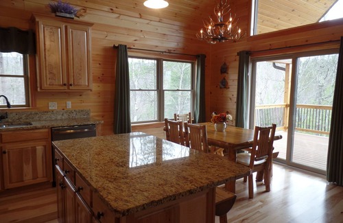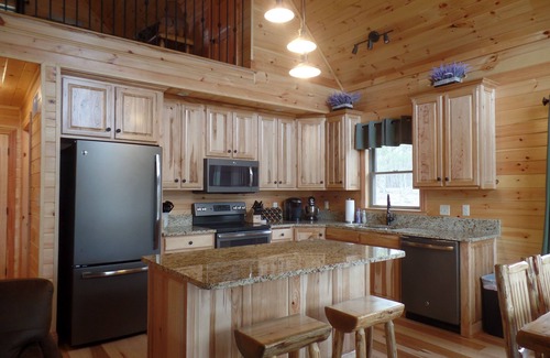 Buck Haven features two king bedrooms with plush bedding. Custom hickory cabinets, hickory floors and custom American made cedar log furniture decorate the cabin. You can relax on the comfortable Lazy Boy furniture in the great room and enjoy the stunning floor to ceiling stone gas fireplace. The main floor bathroom includes a large jetted tub and a walk in shower. . The kitchen has granite counter tops, GE Slate HE appliances and is stocked with everything you will need to fix a delicious gourmet meal. You can grill outdoors in any weather on the covered porch.