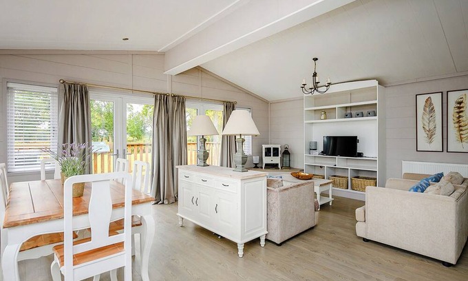 A luxurious lodge with one master double with en suite shower room. One twin room or double with en suite shower room (please check when booking). open-plan living and kitchen area with doors leading to outdoor hot tub and decking.