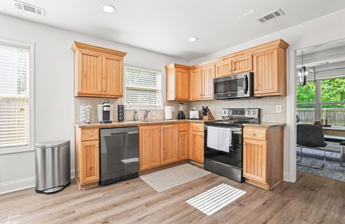 With three spacious bedrooms, each sporting a widescreen smart TV with streaming capabilities, as well as two full bathrooms, there's more than enough room to house and entertain a full family. The master bedroom includes an expansive walk-in closet, a king-sized bed, and an en suite bathroom, and the second bedroom has a queen bed, a gorgeous wooden office space, a giant floor-to-ceiling mirror, and access to a full-sized Jack-and-Jill hall bathroom. The upstairs bonus bedroom sports two full-sized beds and a desk, perfect for a little quiet separation from the hustle and bustle of the downstairs living space!