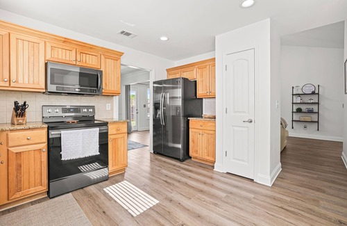 The kitchen, which can be accessed either through the two-door garage, via the living room, or through our elegant formal dining room, which can seat 8, is stocked with a full set of non-stick pots and pans, all the cooking utensils to fulfill your culinary desires, high-end and modern appliances, a full dining ware set, and a Keurig coffee maker alongside a fully stocked coffee bar.