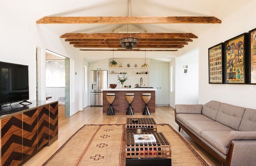 Los Angeles is calling! Come welcome the new year in this immaculately appointed Silverlake split-level. Once a well-loved hunting cabin from 1905, it has been utterly transformed into a lush & tranquil compound -- while still remaining eminently walkable. From the custom dining niche done up in zellige tile, to the walnut-clad sauna, to the venetian plaster of the bedroom... unpretentious luxury surrounds you at every turn. A wrap-around deck with tip-top views of downtown & Elysian Hills keeps the sun close at hand. Open-plan living at its best, fully furnished throughout with one-of-a-kind pieces. Plus the whole backyard is ringed with passionfruit vines! A truly decadent way to spend a season.