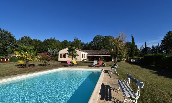 A modern, spacious, detached house with private covered pool and fenced garden is located in Saint-Martial-de-Nabirat. A modern, spacious, detached house with private covered pool and fenced garden provides accommodation, featuring TV, Security/Safety, Bedding/Linens, among other amenities. This House features TV, Security/Safety, Bedding/Linens, to make your stay a comfortable one.