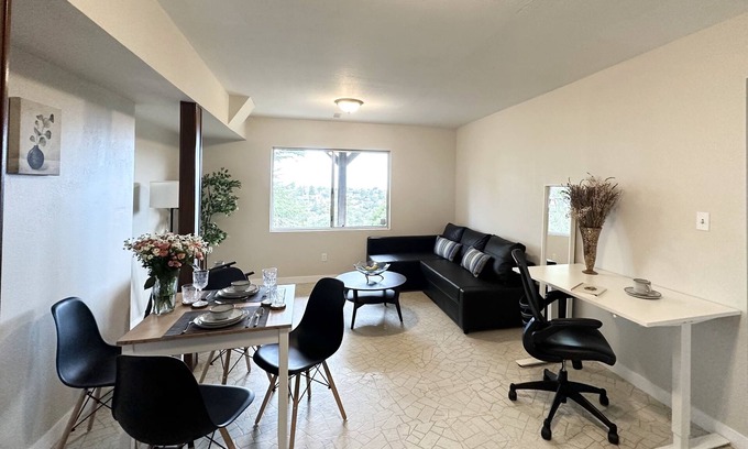 This newly furnished one-bedroom suite with a beautiful view of the bay is located on the first floor of a two-story house in a quiet and tranquil neighborhood in Belmont. Belmont is centrally located between San Fransisco and San Jose, with easy access to nature, multiple culinary diverse downtowns, and the airports. This place has a master bedroom with a queen-sized bed and a sofa bed in the living room, a kitchenette, a dining area, a dedicated workspace, and a shared free washer and dryer.