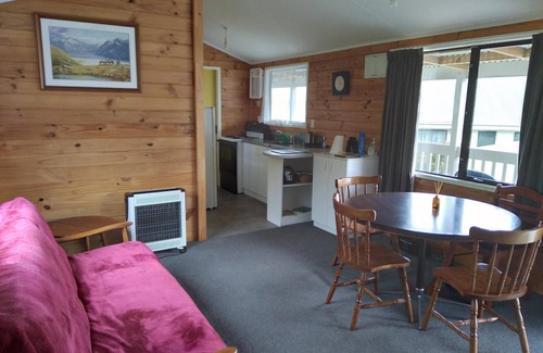 The bach has open-plan kitchen, dining and lounge area, a double room with queen-size bed and a second bedroom with two single beds, all with a view of the lake. There's a double sofa-bed in the lounge and a combined laundry, shower and toilet.