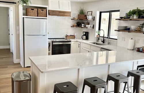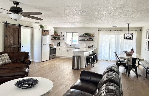 This newly painted and updated open floor plan house is in the perfect location for all your needs. It is located 5 minutes to Laughlins Casinos and less than 10 minutes to Katherine's Landing. There are many neat areas to hike within 15-20 minutes from here. Our Peaceful Place includes 3 bedrooms which sleep up to 8 people, 2 full bathrooms, kitchen, dining and living spaces. Our flooring throughout the house is stained concrete which can feel slick with socks on so we recommend barefeet or shoes while walking around.
