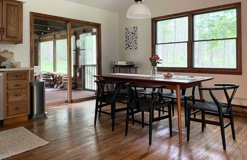 Tucked down a private wooded driveway, The Cabin sits in a quiet clearing. Enter from the front porch into the heart of the home: