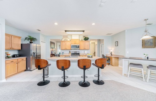 Our tranquil and comfortable renovated home is perfect for families and friends who prefer spacious accommodations. Experience home away from home with perks at Casa La Paz. The four-bedroom, two-bath home features a large screened-in Lanai, a resort-style recreational saltwater pool, a spa hot tub, and an outdoor grill. Enjoy waking up to the sound of waterfalls and native birds in your little private oasis from home. We are located in a peaceful gated golf community, centrally located between the amusement parks, beaches, and Cape Canaveral. Approximately 25 minutes from Orlando International Airport, 30 minutes from Disney, Universal Studios, Sea World, Cocoa Beach, Cape Canaveral, and so much more.