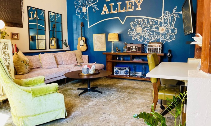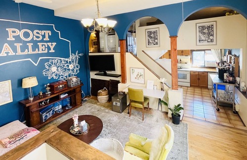 Space: As you enter, the 14’ ceilings and arches invite you into the main area. Comfortable chenille sofa and velvet rocking chair. Flat screen TV hooked to Apple TV with remote. Victrola record player with several old records to play. The kitchen is fully stocked with spices, tea, coffee, sweetener, pots, pans and sharp knives. Water filter pitcher in fridge. Unit not comfotable for children under 9 years.