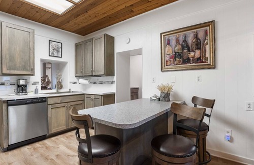 The inside spaces here are decked out beautifully with wood and stonework, including everything from custom molding and trim to a sliding barn door entrance to the second bedroom. Every inch of the place is climate-controlled, with central air and heat and ceiling fans. There's a comfy and welcoming living area, which flows into the dining space and full kitchen. This space includes not only bar seating, but a dedicated workstation and smart TV, too! The kitchen is equipped with modern appliances, a walk-in pantry, and plenty of cookware, dining ware, and utensils. You'll also find a walk-in laundry room for your convenience!