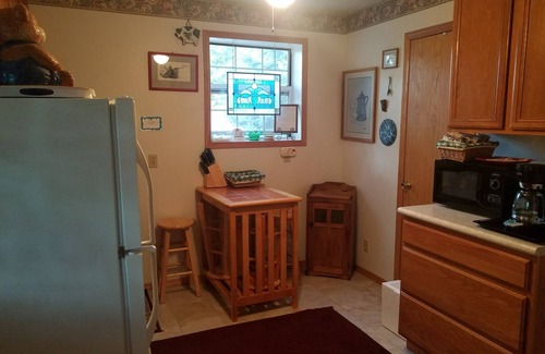 Deer Haven Guest Cottage (VRBO 431820) consists of two bedrooms, the master suite has a queen size bed and a walk out patio, the guest bedroom has a queen size bed, one bathroom and a fully stocked kitchen/dining room with a living room and dish network. It is approximately 1300 sq ft. A roll a way bed is also available. The cottages are surrounded by gardens, a shrine and a reflecting pond.