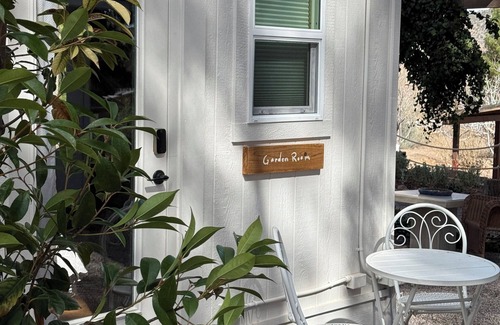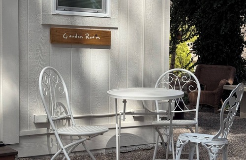 Facing east with views from the upper back garden, The Garden Room, is a private studio that is located off of the Sunshine House. Our garden room features a small kitchenette complete with a mini fridge, microwave, and coffee maker. The room is private, cozy, and has a small working space and bistro seating outside for dining.