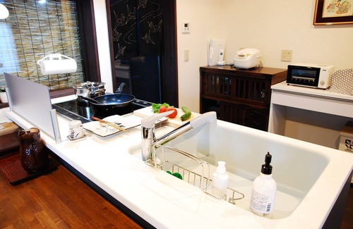 This fully renovated 100yearold townhouse is located a 3minute walk from Nishichaya District The 127squaremeter Kaiyu Wing equipped with a large kitchen and a cypress bath can accommodate up to 10 guests It is recommended for families and groups The Izumi Wing equipped with a family kitchen and an 115tatamimat bedroom can accommodate up to 5 guests Connecting with the adjacent Kaiyu Wing allows for a maximum of 15 guests Towels bath towels face towels and amenities toothbrushes and hair brushes are provided In keeping with the SDGs linen changes are available upon request starting from three nights For guests staying multiple nights towels one bath towel and one face towel per day will be provided for the night There is no parking available so please use the nearby coin parking We cannot accommodate more guests than the number of guests booked / The spring has a pleasant sound of water