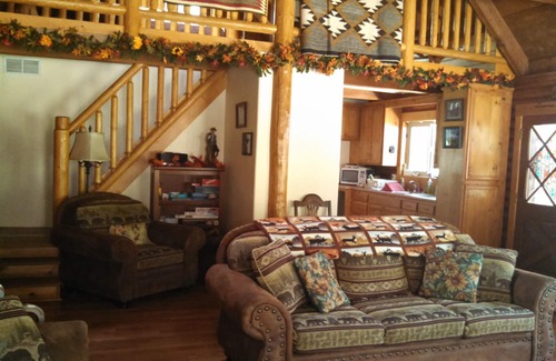 The cabin is close enough to Hwy 245. But has plenty of privacy with a feel of living in the forest, and the property includes a seasonal creek. The mountain environment is extended indoors with the furnishing of wood and stone themes. The log walls and steeply pitched cedar ceiling provide a feeling of warmth or sit out on the deck with a cup of coffee or a glass of wine and enjoy the cedar, pine, and oak trees and have a view toward the creek bottom. Habitat of numerous wild birds including Steller jays and acorn woodpeckers. A short walk on the Creekside trail provides seasonal blackberry picking opportunities or sit under the sprawling canopy of the mature Valley Oaks and listen to the wind.