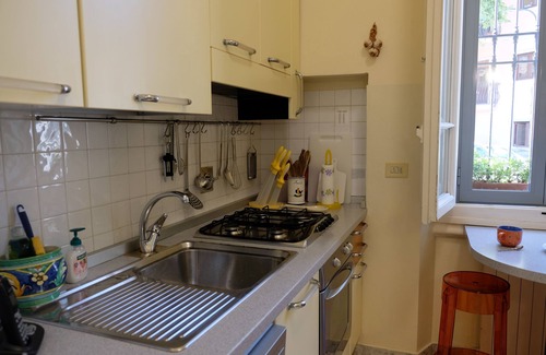 The house is perfect for two to four people (not more). It is approximately 110 square meters (or 1100 square feet), not counting the rooftop terrace. The house is one story at street level, no one above or below. It gets lots of light, and all windows and doors are double-paned. The house has two “regular” bedrooms with doors that close: one with an Italian matrimoniale-size bed (US king bed equivalent), a frescoed ceiling, and French doors; the other has extra-long twin beds. The third bedroom is a very small, open (no door), loft bedroom (up ten steps) with a US-queen-size bed. The house has two bathrooms, both with modern fixtures and showers; the larger one also has a tub.