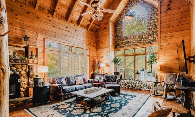 Unwind in the Smoky Mountains at our rustic luxury real-log cabin retreat with a spacious main cabin and a separate guest cottage. The artisan-carved front door and large covered front rocking porch welcome you to a hand-hewn log home that spares no luxury. Every detail has been carefully selected to enhance our guests' experience.
