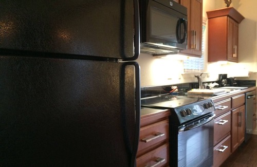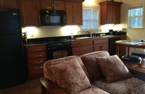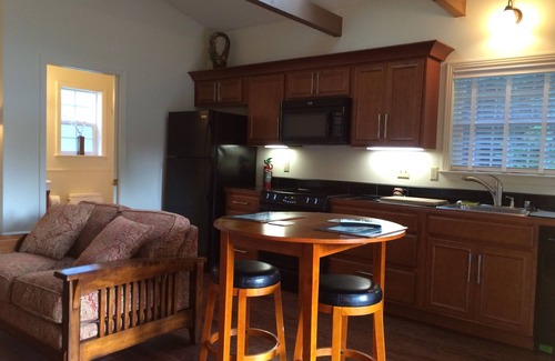 The cottage features a beautiful Zen-like waterfall with a peaceful pond. The interior includes a full kitchen with black granite counter tops, built-in microwave oven, glass-top cooking with a self-cleaning oven and full-sized refrigerator. The built-in fireplace, all wood floors, premium queen-sized bed with memory foam mattress, TV and free wireless internet allow you to experience all the conveniences in an unbeatable setting.