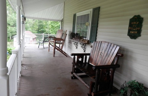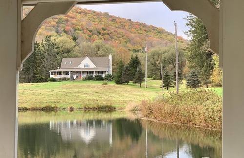 The house is set on 60 Acres of farmland, fields and hills. Boasts a pond with a gazebo, a stream with a bridge. Lots of room to run and play. A quiet setting to get away from the stress and hectic day to day chores. There is a 90' wrap around porch with a screened in section for dining. There are bunk beds, toys and games for the kids. There is a sleeping loft with 2 double beds. A large fireplace for roasting marshmallows. A washer and dryer. A full kitchen. Satellite TV, WiFi and a game table.